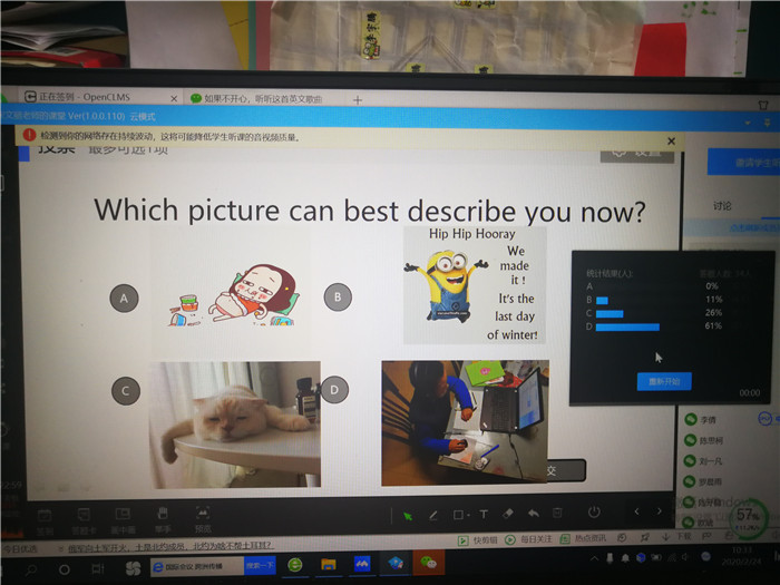 第一天线上授课情况平稳,开始有老师反馈雨课堂无法正常登录,但是过了一会儿情况得到缓解。雨课堂无法正常登录时,很多老师采用了腾讯会议或腾讯课堂的预案,达到了不错的效果。以腾讯会议为例,老师们可以在授课时与学生共享屏幕,让学生实时看到PPT上的内容。并且可以通过语音或打字的方式随时与学生进行互动。