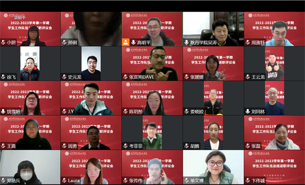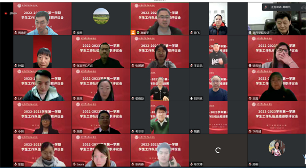 为深入贯彻落实立德树人根本任务,搭建学生工作队伍交流学习平台,不断提升我院学生工作队伍的专业化、职业化水平。12月21日,2022-2023学年第一学期学生工作队伍述职评议会以线上会议形式召开。常务副院长吴涛、副院长李永军、刘林、党委副书记孙磊、院长助理徐飞、田野以及学院各职能处室负责人、二级学院院长参加了会议并对学生工作队伍进行了评议,会议由学生事务办公室副主任高明平主持。