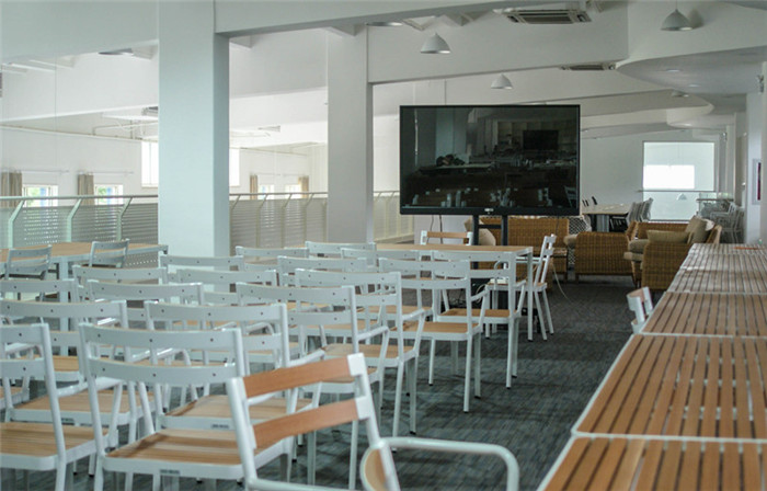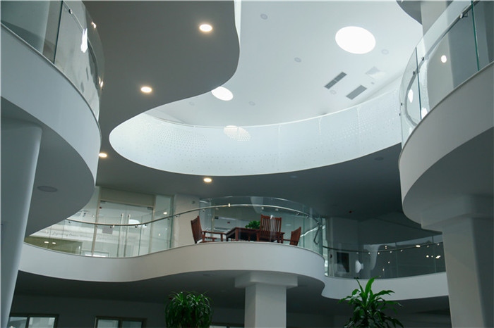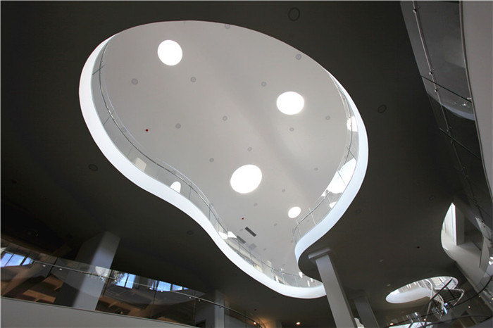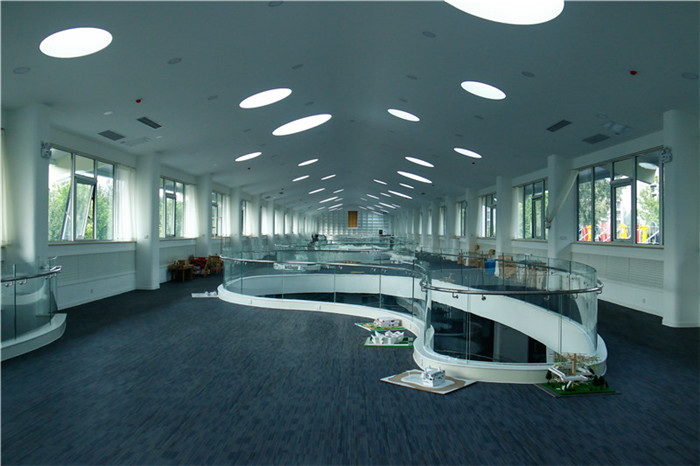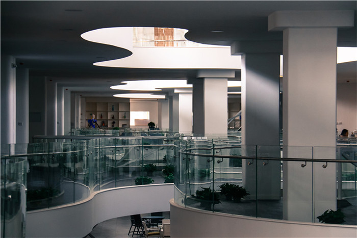 白羽老师:为了防止夏季过强的阳光形成温室效应,在玻璃顶棚和半弧形穿孔钢板之间设置了自动遮阳幕,将遮阳幕关闭后,日间的采光就交给了抬高的侧窗。最终的顶棚方案考虑到造价过高和后期的维护困难,做了简化处理,我又将屋顶上无规律地开了0.6m-1.2m直径不等的圆形天窗采光。