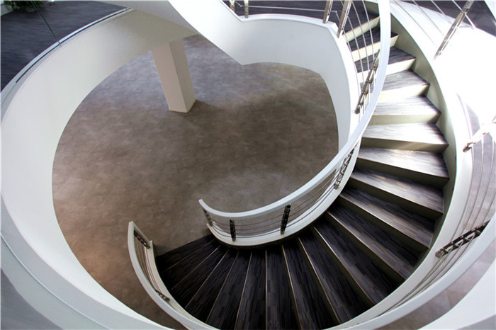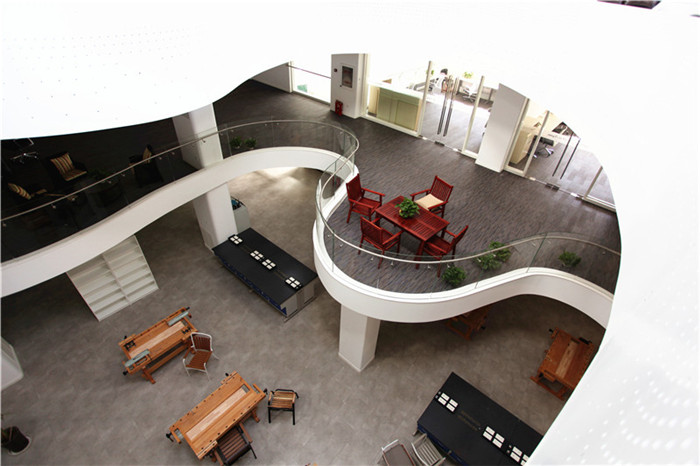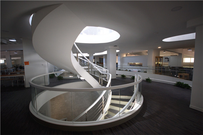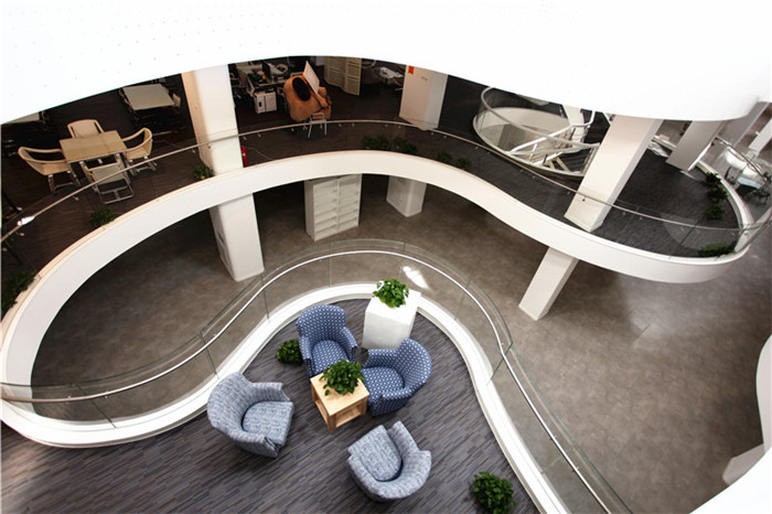 白羽老师:这样的楼板与原有建筑室内空间的“插入”模式犹如双层漂浮结构,与原有厂房结构以两种设计语言相互辉映。在空间感和平面操作上,我将两层楼板在中心吹拔处做曲线处理。在楼板重叠的部分设置旋转楼梯作为立体交通设施,楼板不重合的区域形成采光空间,让三层的自然光可以穿过二层交错的楼板,洒向一层的中庭。二层与三层的随机交错的曲线楼板犹如室内中两片不同高度的云层,漂浮在当代“巴西利卡”的内部空间中。让在其上工作与学习的感受如漂浮在云端一般。从而让想象力与身体一起,飞展漂浮。