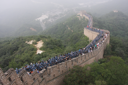 清晨7点,2011级新生在基地领导的指挥下,从基地训练场整装出发,徒步奔赴八达岭长城。行进途中,学生们按照教官的指导进行了穿越“染毒地带”、防空袭等科目练习。面对模拟环境的训练,同学们反应迅速,应对有序,七天的军训成果得到了很好的体现。7点40分,队伍到达八达岭长城。长城的巍伟景观和训练的高昂气势令全体新生热情高涨,大家都忘却了一路的辛苦,登上长城,展示自我,成为长城上一道英姿飒爽的风景线。