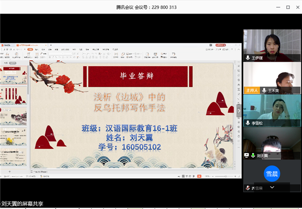 2020年5月6日,人文学院汉语国际教育专业教研室2016级学生毕业论文答辩工作顺利开展。本次答辩对象为汉语国际教育专业2016级全体同学,参加此次论文答辩工作的教师有刘彦、王晓彬、卢雪云、李雪松、高青、王禾奕、陈晨、元振芳、王伊璞。