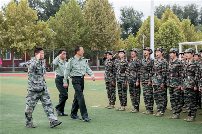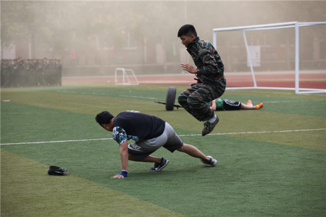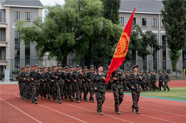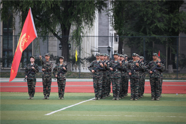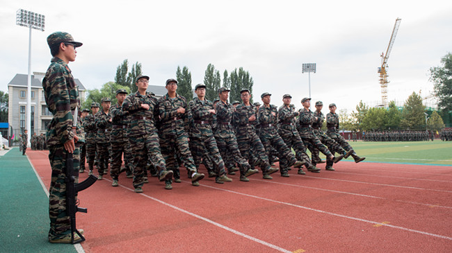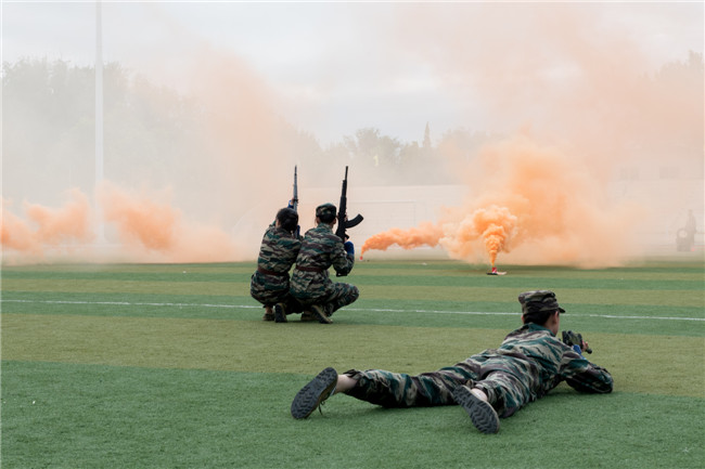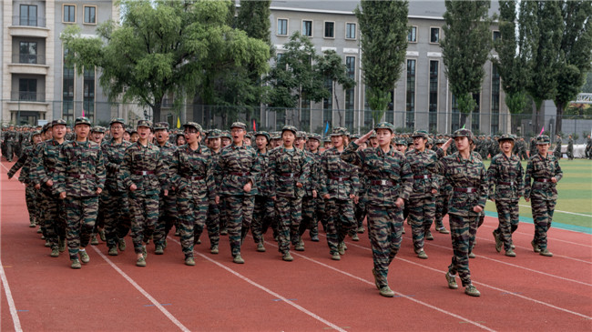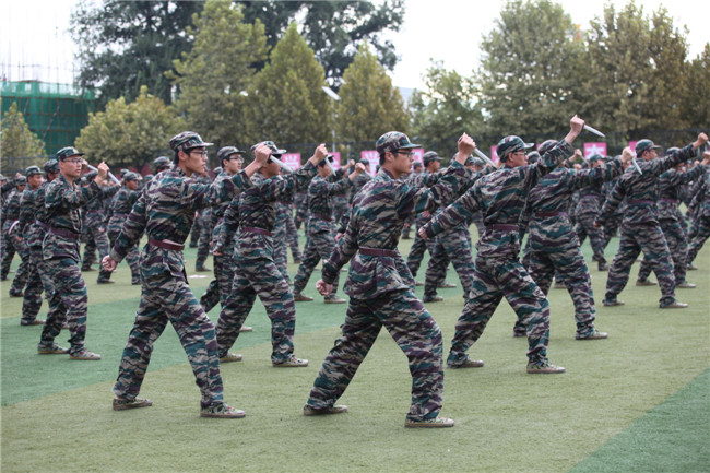 随后,新生军训团进行了分列式表演,他们步伐整齐,英姿飒爽,喊着响亮的口号,展示了新一届耿丹学子的风采和军训训练成果。分列式结束后新生军训团的同学还进行了军训项目的汇报表演,本次演出内容丰富,包括匕首操、三声三相、以及三防反恐演练等。同学们的精彩表演博得了领导和老师们的阵阵掌声。