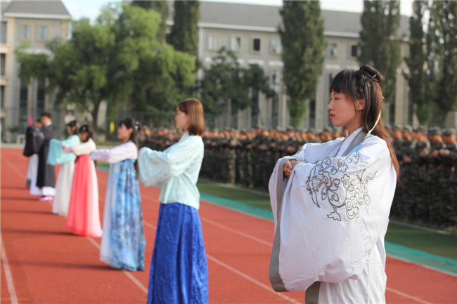 在本次开学典礼上的一个亮点就是,由学生社团――陌樱汉服社的同学们带领2016级全体新生向教师代表行拜师礼,同时还为教师代表敬献鲜花。
