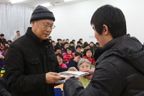 扎世君副院长及王爱平系主任分别为获奖学生颁发奖品并合影留念,2008级焦宏达同学的获奖感言激励着在场所有的同学,并将活动纪念相册送给了细心指导他们的韩光胜教授,以此表达对老师的感谢。韩教授对获奖同学表示祝贺,再提希冀。