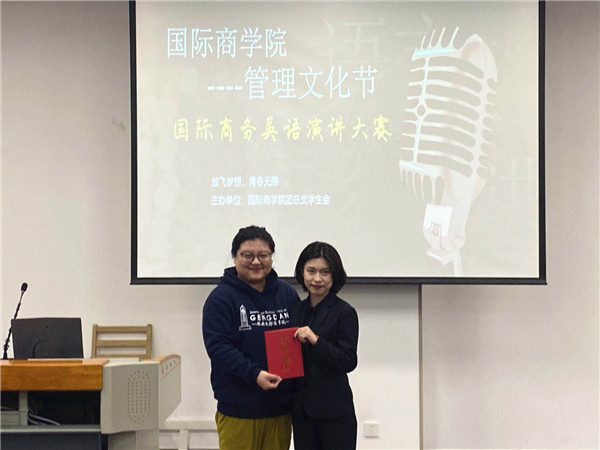 国际商务英语演讲大赛作为国际商学院的专业性比赛,提供给商英院学子一个展现个人风采的机会,锤炼同学们的口语水平和演讲能力,提升其运用语言的综合素质。同时,激励更多商院学子积极参与专业竞赛,在比赛中锻炼本领、积累经验。愿商院学子学以致用,施才展华,努力提升专业能力和综合素质,争取未来在祖国的要的地方贡献光和热。