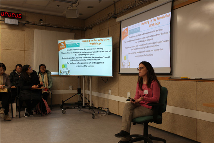 会谈开始,模拟教学中心的Sharon Hollombe对模拟工作坊进行了介绍,讲解了教育冲突中人际交往能力的培养。该工作坊的目标是提高在冲突中审视自身与他人的能力,提高获得技能的能力以便进行密切的交流。开始的短视频介绍了巴伊兰大学教育学院的Harlev中心,它是由教育部成立非政府性组织,全年为在校生、教师进修、中小学校长等提供工作坊培训,核心课程是提高教育冲突环境中人际沟通的能力,旨在提高学生日后实际中解决冲突的能力。每个模拟工作坊持续四小时,在工作坊开始前就为学生定制三个模拟情景。情景以学生作为教育者会面临的实际情况为基础。学生在每个模拟前会了解相关背景信息,然后由一名组员自愿参加到模拟当中。模拟在卫星工作室中进行五分钟,其他成员观看直播视频。