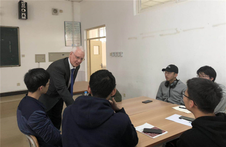 会谈结束后,Jonathan教授来到了2017级、2018级软件工程国际班同学们的课堂,与他们进行面对面交流以及示范教学。会前,教授与同学们进行了短暂而愉快地交流。在课堂上,Jonathan教授首先介绍了他的研究案例,之后对哈德斯菲尔德大学做了图文并茂的说明,最后对软件工程专业的就业前景、毕业后平均薪资以及在英国学习需要的项目管理能力、逻辑推理能力等做了详细介绍。Jason老师也补充到:哈德斯菲尔德大学是英国最早的十所大学之一,而且在留学生满意度排名表中,长年位于第二的名次;课程方面,每堂课都会有录播,方便同学们课后回顾并及时掌握知识点。现场同学也积极地与教授进行互动交流。