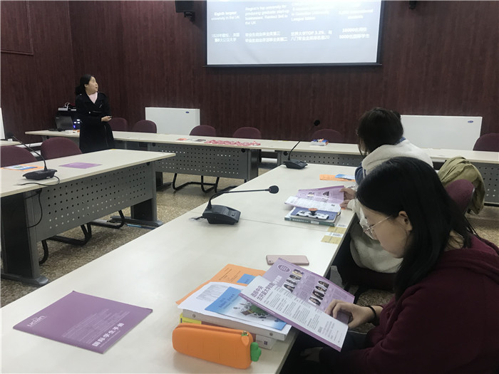 两位老师分别为同学们介绍了两所学校所处的地理位置、城市概况、城市设施等。随后又对赫尔大学、中央兰开夏大学的优势专业、入学要求、费用及奖学金、学校排名、学校宿舍等内容做了详细介绍。说明会现场,同学们认真聆听,积极提出各自的留学问题,如:是否有奖学金,申请材料都有哪些等等,主动与老师们交流互动。