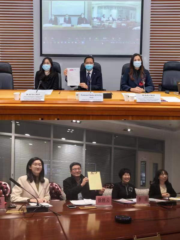 12月17日上午,通过视频连线的方式,我校与香港公开大学远程签署合作协议。香港公开大学人文社会科学院院长邝志良教授、香港公开大学人文社会科学院全日制研究生课程统筹陈家愉副教授及各课程主任在香港公开大学赛马会会议室出席本次签约仪式,我校教学副院长徐胜云教授、人文学院院长李洁博士、国际交流办公室暨港澳台事务办公室王小宇主任及项目主管宫晨老师出席本次活动,共同见证两校签署合作协议。