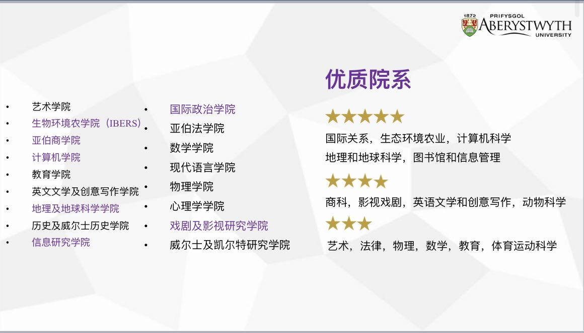 亚伯大学始建于1872年,距今有150年的历史,是威尔士最古老的大学。学校地处英国西南部的亚伯市,是威尔士中部最大的商业文化中心,也是英国著名的旅游度假胜地。亚伯大学紧邻全英第二大的国家图书馆,地理位置十分优越。学校师环境优美,基础设施齐全,科研实力雄厚、教学质量优越,在泰晤士报高校排名中位列全英第38位。亚伯大学设有工商管理与科学、艺术与社会科学、地球环境与生命科学三大学部,其商科、影视戏剧、计算机科学专业实力突出,在业界具有相影响力。