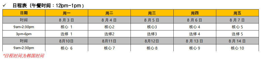 项目简介:韩国汉阳大学将在今年8月开展为期2周的线上课程,学生最多可选择两门课程:一门必修核心课程(3学分)和选修课(1学分)。