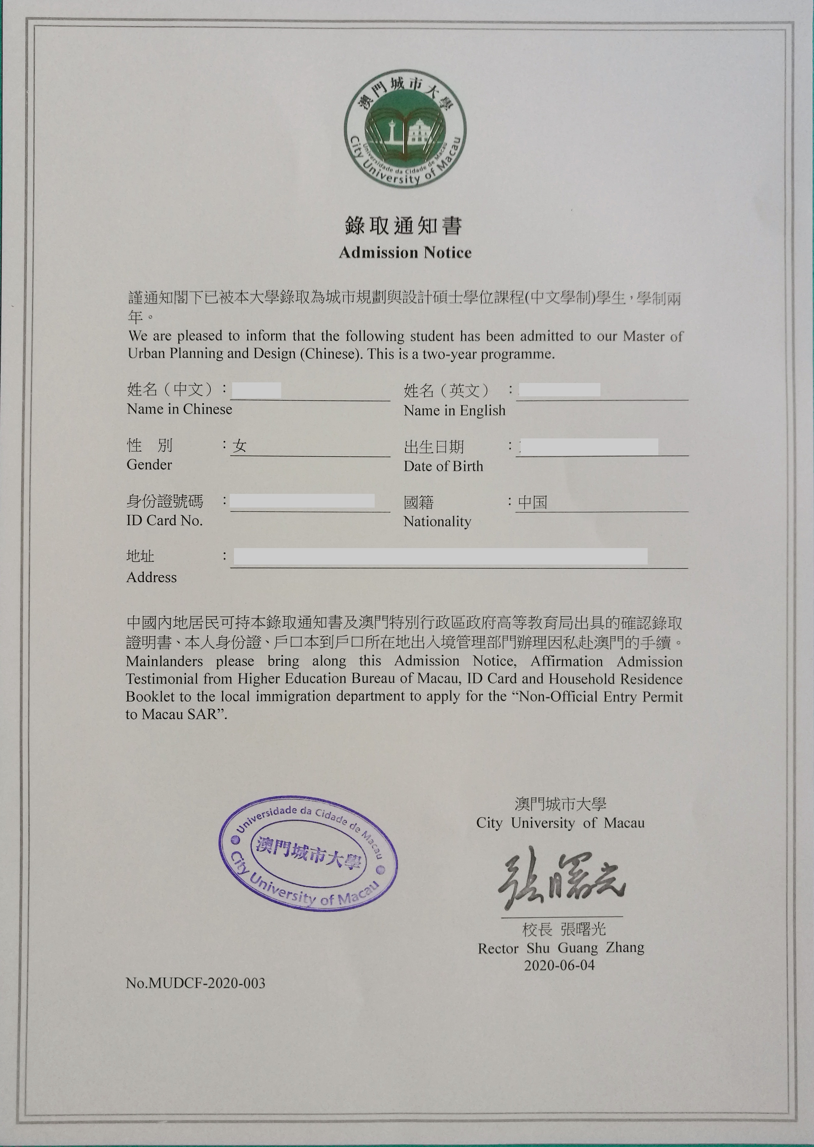 澳门城市大学硕士课程录取通知书展示: