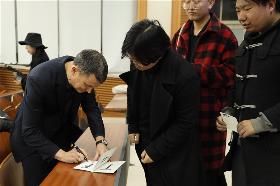Phil教授分享了二百多件作品,含诸多字体和书籍经典作品。他强调用材料完成作品,用身心感受生活中的魅力,这样的作品才更灵动。他的作品中有很多动物,源于孩童时期对动物的喜爱。Phil教授推荐了他的最新作品《年轻的设计师,你是否迷茫又着急》,这是一本设计师入门指导书,他介绍了书的主要内容和创作理念。学生们用英语积极地向老师提问,Phil教授耐心回答并送给每位提问者礼品。讲座结束后师生合影,Phil教授为学生们签名留念。(国际设计学院供稿)