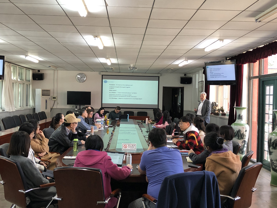 为进一步推动我校“在地国际化”战略的实施,吸引国外合作高校派送更多的留学生来我校学习和交流,同时输送我校更多的学生参加海外交换生项目,加强和改进专业课的全英文授课质量管理已经成为我校常规教学管理的一个重要环节。自3月11日起,耿丹国际商学院邀请国际豪斯语言学院伦敦校区(International House London)前首席执行官Steve Brent教授来校开展为期一周的全英文授课评估工作。Steve Brent教授通过调查问卷、进班听课、与师生代表座谈以及走访各二级院系等方式,已对beat365英国官网的全英文授课现状、取得的效果及实践中遇到的问题等进行了全面、深入的了解。