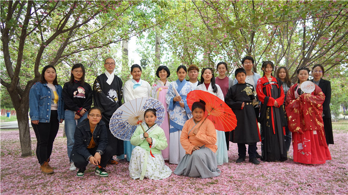欢迎会后,来自学校汉服社的同学为泰国师生展示和讲解汉代服饰的形态礼仪及历史文化。在展示过程中,泰国师生表现出对汉代历史及文化的浓厚兴趣,并着汉服进一步感受中华传统文化的魅力,纷纷在樱花树下拍照留念。
