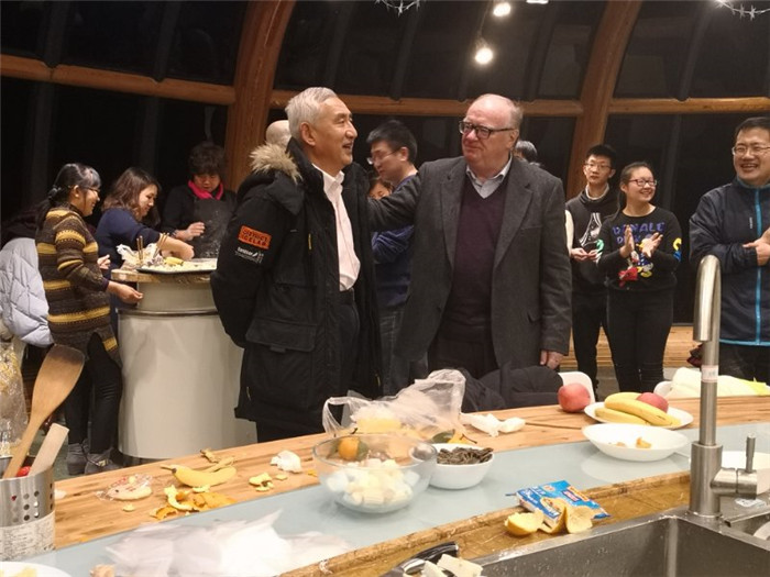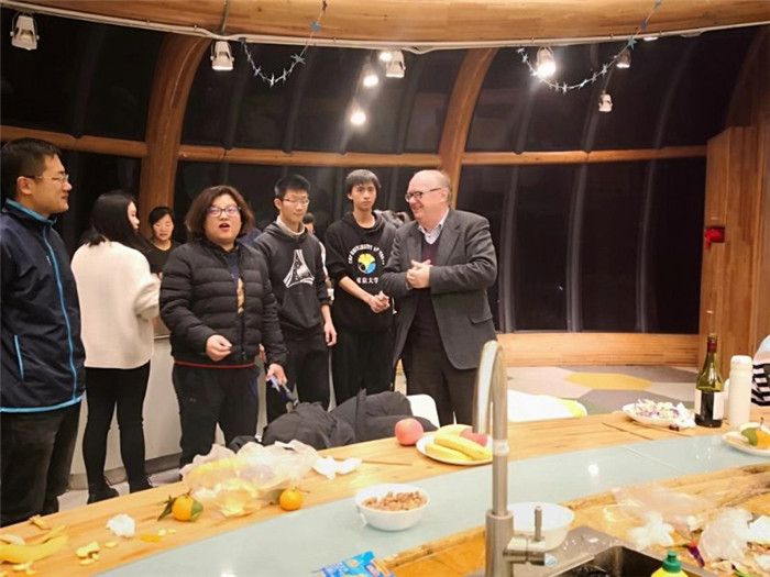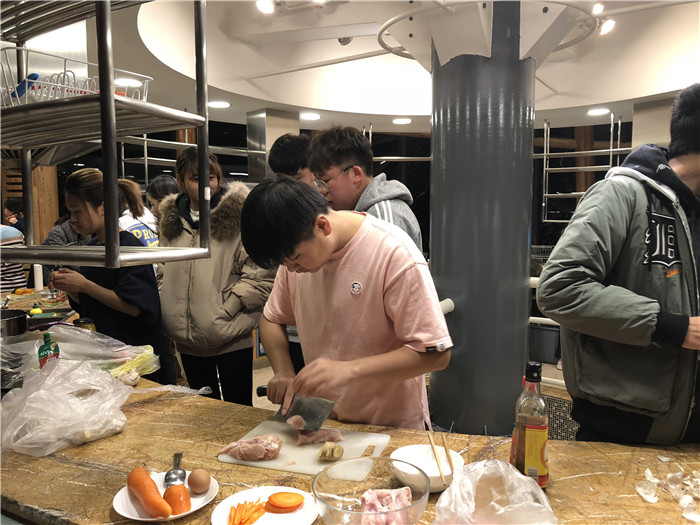 首先,国际商学院院长Paul致欢迎辞,对各位领导、老师和同学们的到来表示感谢,同时祝福在场的老师和同学元旦快乐,猪年快乐。接着,师生展开了一场趣味包饺子活动。伴着新年主题的音乐,现场气氛十分热烈。同学们纷纷展示厨艺,水煮牛肉、培根金针菇、菠萝古K肉、土豆炖排骨、粉丝娃娃菜、水果沙拉,一道道美味佳肴接被摆上餐桌。为了活跃现场氛围,丁晓良院长为大家演唱了歌曲,赢得了全场掌声。