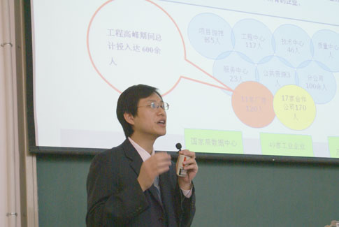 为增强计算机科学与技术专业学生对实际工程项目的了解和认识,提高学习兴趣,明确奋斗目标,信息工程系特邀中软国际软件人才实训基地软件工程师于3月18日下午为06级计算机科学与技术专业学生做了计算机软件实训项目推介动员会。工程师郭玉成在报告会上介绍了中软国际集团及人才实训基地的基本情况及具体的实训项目方案,介绍了软件公司对人才的需求标准,指出了应届毕业生在实际项目开发经验上存在的欠缺,阐述了参与实际软件工程项目实习实训的必要性。技术总监周海以案例形式介绍了实训具体过程。