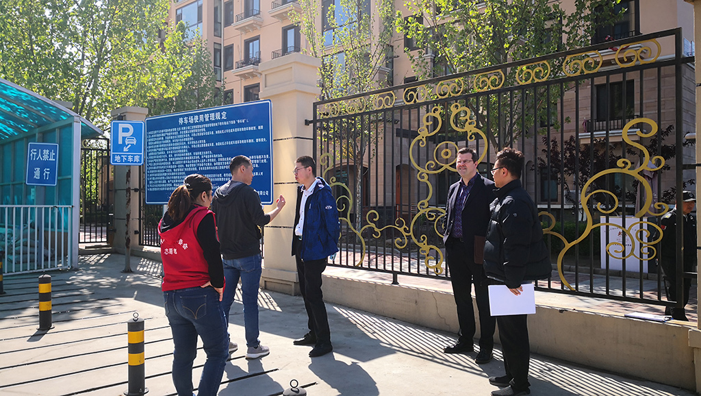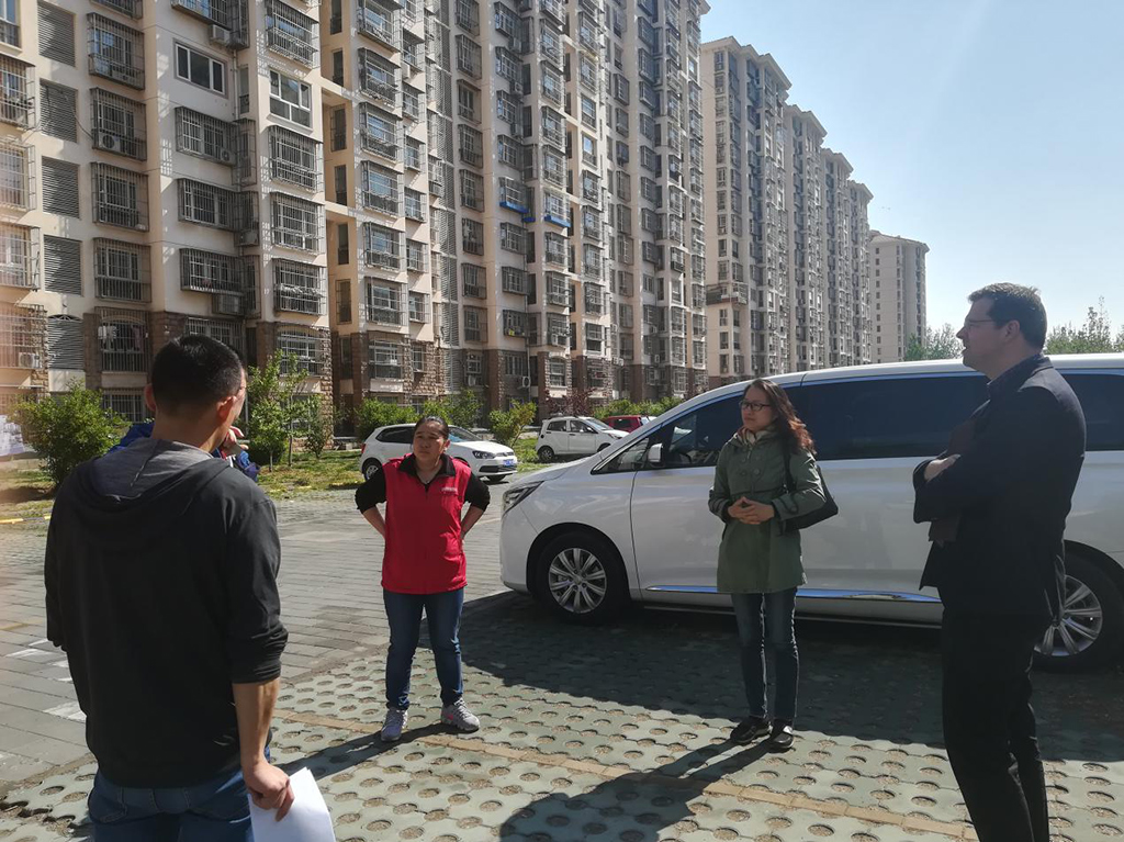 随后,管委会人员带领专业教师实地勘查了恒华地产以及周边区块,细致的调研了地上和地下的停车和交通的现状,发现南北区块停车以及建设情况迥异,南边区块环境优越,人车分流较好,而北边区块两限房和回迁房的人行通道与停车问题严重。老师和David认真听取了管委会以及当地居民的意见,并且对提出的一些具有建设性的意见进行了讨论,大家一致认为由于不同房屋性质导致的人行、车行以及停车矛盾日益突出,需要统一规划和政策引导。