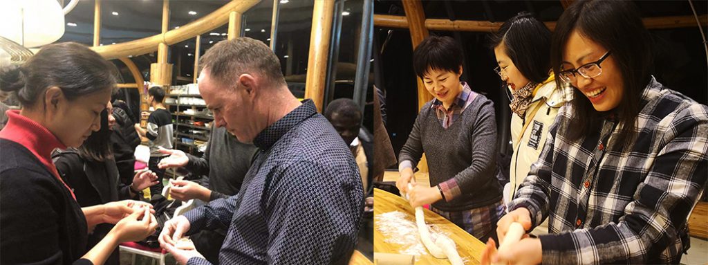 本次活动充分展现了中华传统美食的魅力。中外师生共聚美食驿站餐厅,以包饺子、吃饺子为话题,边做边聊,增进了中外文化的相互了解,也增进了学生们的生活动手能力。活动一开始,是由王家松院长和李京增副院长共同指导学生们如何做馅,外教们更是对擀皮和包饺子感兴趣,甚至还大胆尝试创新出各种不同的饺子样式。