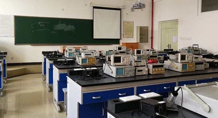 电子测量实验室占地108平方米,设有25个教学工位,里面含有新旧各类仪器如电源、信号源、示波器、万用表、频率仪等,还有仪器测试需要的各类元器件。学生们可以学习各类仪器的使用性能,了解各类仪器的特点、使用范围及使用注意事项、所测参数的计算。