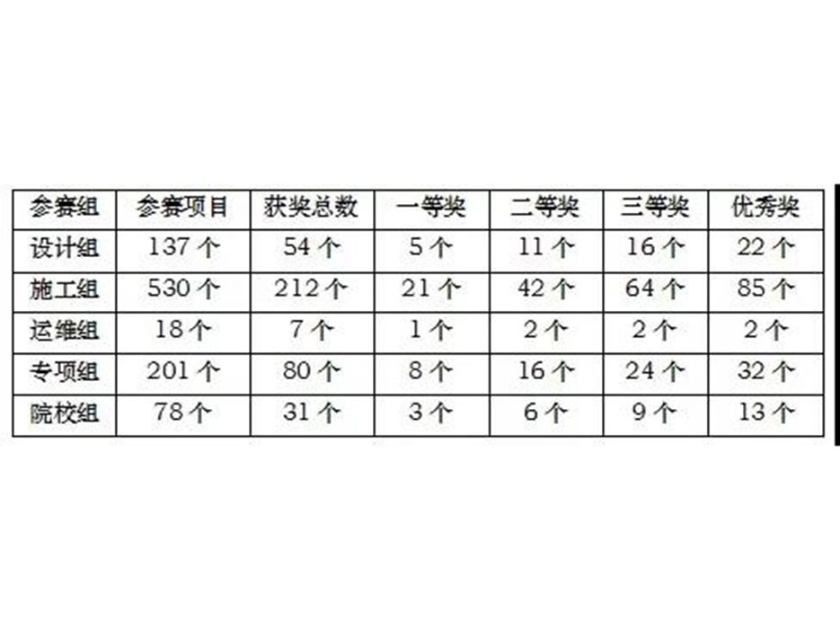2019年11月8日,第五届“科创杯”中国BIM技术交流会暨优秀BIM案例作品展示会大赛,在北京中国国际展览中心(新馆)举行,本次参赛单位来自全国各地,参赛BIM作品1000多份,涵盖BIM应用的各个阶段。获奖作品数量为参赛作品数量总数的40%,其中每个组一、二、三等奖及优秀奖比例为1:2:3:4,详见下表: