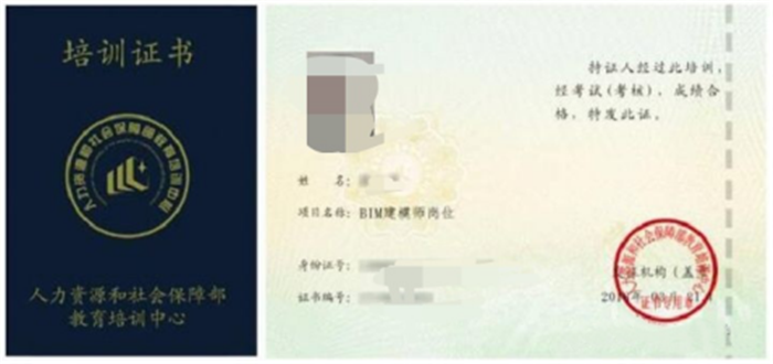 经考核合格,由人力资源和社会保障部教育培训中心颁发项目名称为“BIM建模技术、BIM高级建模技术(建筑、结构、设备专业)、BIM应用设计技术(建筑设计、结构设计、建筑设备设计、建筑施工、工程造价管理)”的培训证书,证书可在人力资源和社会保障部教育培训网查询。