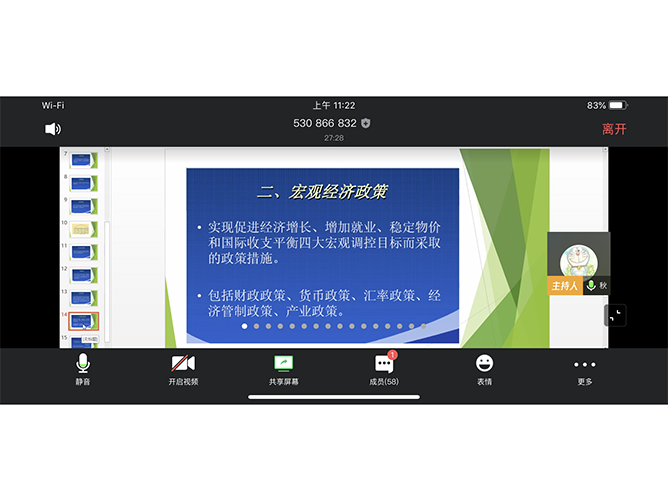 赵雪莹老师的《财务管理基础》和《BIM工程项目管理》课程,采用建筑云课+腾讯会议+微信,顺利完成课程任务。同学们全过程在线,讨论问题积极踊跃,互动效果良好。考勤系统或建筑云课签到,腾讯会议视频、语音PPT展示,视频轮转切换,语音互动回答问题,全程无卡顿。完成情况良好,课程运行顺利。