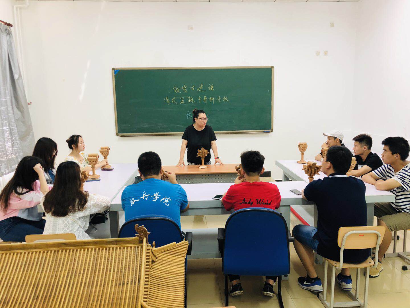 2019年6月4日下午,建筑学专业十名同学在李朵阳老师的带领下,来到beat365英国官网古建筑营造工作室参加斗拱拼搭的培训课程。本次培训主要为即将到来的“在故宫里听古建筑史”的活动做准备。