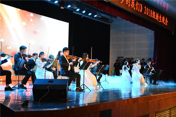 晚会在主持人的歌声中开场,一首《我们的18岁》将晚会拉开序幕,管弦乐团表演的器乐合奏《第二圆舞曲》掀起了晚会的第一个高潮,同学们被肖斯塔科维奇那优雅的乐曲所陶醉;吉他弹唱《现在就出发》萦绕耳畔,令人感慨万千;丁晓良副院长献唱一首《致亲爱的自己》表达了自己对新生的殷切期许和真挚祝福,鼓励同学们“少年多壮志,不负韶华恩”,努力做到对自己负责,为社会做贡献;大艺团的朗诵《致青春》和舞蹈《梦幻的八音盒》为在场观众带来了一场视听盛宴;串烧节目《月半小夜曲》展示了来自五湖四海的新生融洽的大学生活;街舞社《real phone》、RAP说唱《目不转睛》、阿卡贝拉《对你爱不完》、独唱《友情岁月》以劲爆炫酷的舞蹈和曲风再次引爆全场;陌樱汉服社的《佳人曲》使观众一睹中华古风舞蹈之韵味,使人回味悠长。在晚会的最后,武道社惊心动魄的表演、动漫社和啦啦操社的合舞《极乐净土》赢得观众阵阵掌声,最后,晚会在热烈的掌声与欢呼中落下帷幕。
