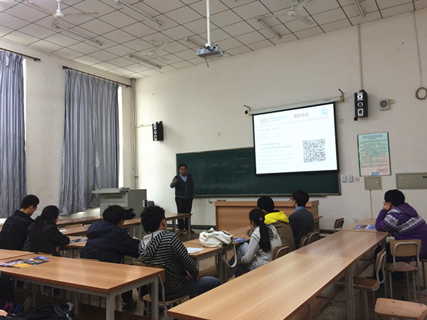 而在B103教室,国际合作与交流处专门请到与美国南伊利诺伊大学有着多年友好合作关系的对外经济贸易大学项目负责人高健老师到校,为同学们具体介绍SIUC的基本情况、专业设置、如何申请、学费标准等情况,并强调该项目每年为学生提供近12000美元的特殊奖学金和优质的教学资源,近年来获得了对外经贸大学学生的关注和好评。说明会后,同学们纷纷提出个人的学习计划与高健老师讨论。(国际合作与交流处供稿)