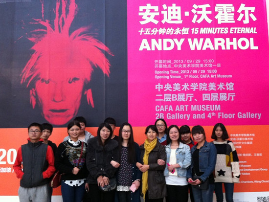 10月24日下午,艺术设计系2011级视传专业的15名学生在秦旭萍老师带领下,到中央美术学院展览馆观看了安迪.沃霍尔“十五分钟的永恒”回顾展,本次共展出了101组作品。