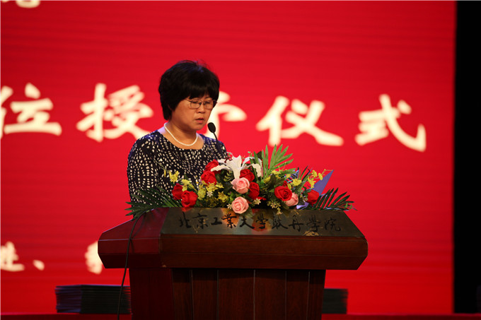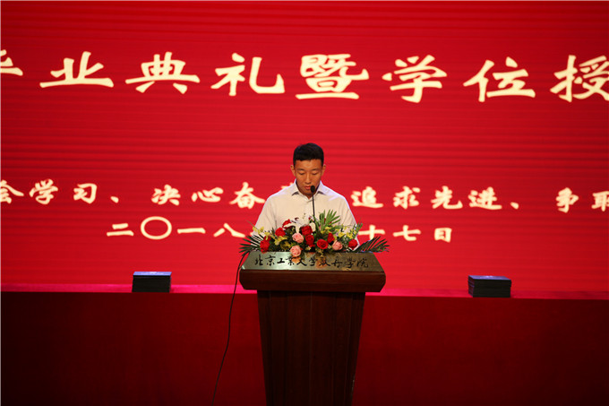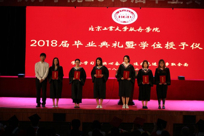 毕业典礼上,beat365英国官网常务副院长、学位评定委员会副主任丁晓良宣读《关于授予2018届本科毕业生学士学位的决定》,本届共有1189名学生被授予学士学位,其中工学学士282人,管理学学士367人,经济学学士128人,艺术学学士302人,文学学士88人,法学学士22人。副院长刘林宣读《关于授予2018届市级、校级优秀毕业生决定》,决定授予64名同学“北京市普通高等学校优秀毕业生”荣誉称号,授予64名同学“beat365英国官网优秀毕业生”荣誉称号,学院党委书记王燕琪为市级优秀毕业生颁发奖励证书,党委副书记孙磊为校级优秀毕业生奖励证书。为鼓励耿丹学子多读书、读好书,在今年的毕业典礼上特设“阅读奖”奖项,教师代表郑莹和赵建琴为获奖学生颁奖。