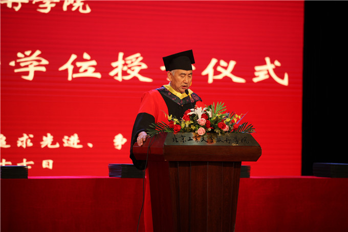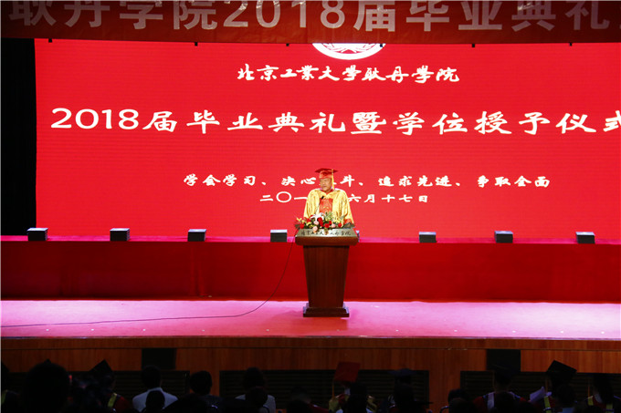 毕业典礼在雄壮的国歌声中开始。林炎志院长首先致辞,在致辞中,林炎志院长对2018届毕业生表示衷心的祝贺,祝贺他们圆满完成四年学业,迈向新的人生征程。他说,同学们,父母是你们的第一家长,作为老师是你们的第二家长,当你们走向社会走向新的岗位的时候,作为家长最大的心愿就是提出希望和嘱托。中国2500年前的老教育家孟子说过,“天将降大任于斯人也,必先苦其心志,劳其筋骨。”后面还有一段话叫“生于忧患,死于安乐。”这段话就是希望你们给自己定一个目标,这个目标从“天”上来,天,就是客观、就是时代、就是国家。这个国家这个时代给予你们什么大的任务,你们就要把它变成自己的人生目标。在离开大学校园的时候,作为家长应该告诫你们,你们走向的世界不完全像校园这样。因为,从我的人生经历看,校园是我们人生最好的时光,你们在校园里没有感受到真正的竞争,你们走向社会的时候公开的竞争是剧烈的,所以这个社会,不光是爱,还可能是恨,只有爱和恨交织在一起才能完成你们一生的成就。我很希望在你们毕业的时候,牢记孟子的这段话,希望你们有成就,更加希望你们记住这个嘱托,把在耿丹学到的知识和能力,用作未来的创造上,实现自己人生的最大理想。