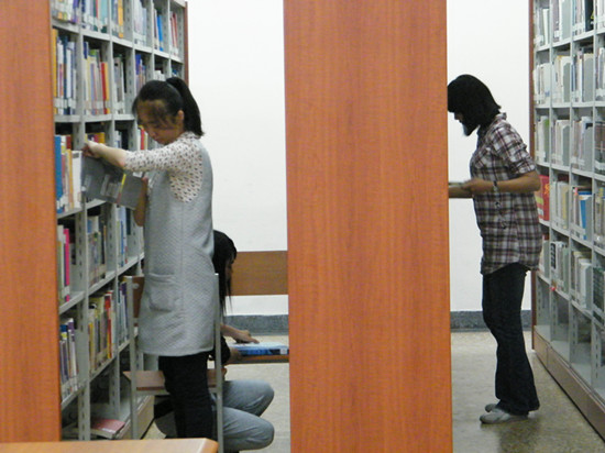 9月27日 下午2012级财务管理专业的杨晶、魏明珠、叶治郡、韩蕊等同学第一次以义工身份来图书馆工作。对她们来说,第一次既新鲜,又感到一份责任。下午3点半她们开始了本次工作,工作内容是架位整理。经过此前培训和见习,一上来她们按照中国图书分类法和排架规则,有条不紊地将错放的书,按照顺序放入正确的位置,参差不齐的书用书敲齐。