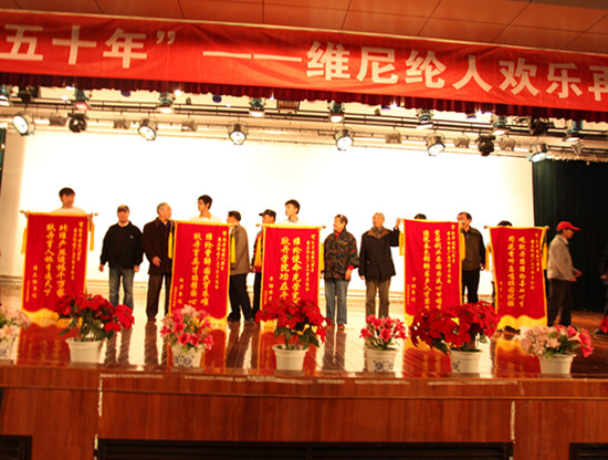 接下来,由原厂职工代表宣读老厂长张乐山写给职工们的亲笔信。张厂长因为年事已高身体欠佳,不能亲临现场只能写信让人代为传达他的喜悦之情,最后由各车间职工代表向学院授锦旗。