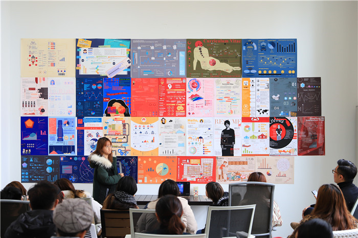 课程中三次汇报,夏岩枫老师对学生们不同阶段的作品进行了指导,使同学们对视觉个人简历和信息图表的理解逐渐深入。学生们布展后进行了总结汇报,介绍了各自的设计理念和创意来源。