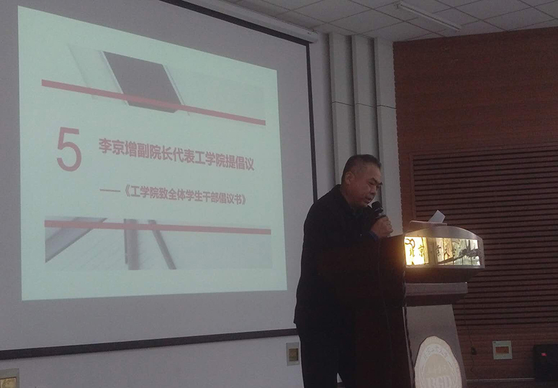 最后,李京增副院长代表工学院向全体学生干部发出倡议。《工学院致全体学生干部倡议书》—要求工学院的各专业班级要在班导师和专业导师的组织下,开好主题班会,制定详细的工作计划,从学生干部做起,带动班级同学刻苦学习。