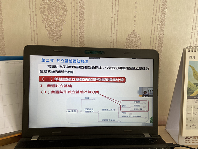张淑红老师的《平法识图》和《BIM造价应用》课程,利用建筑云课、云课堂、微信群、腾讯会议、考勤系统相互配合,开展在线教学。