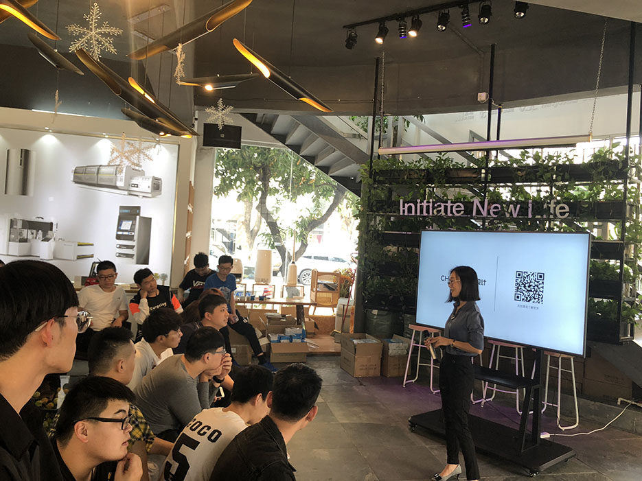 开课仪式结束后,创新设计研究院教务处的黄老师与梁老师带领同学们参观了广东工业设计城博物馆、老年生活体验馆。11日下午参观考察了潜龙设计、和壹设计、米朗设计及骏铭三维科技等4家工业设计城园区内的公司。通过参观调研,同学们收获颇丰、感触很大。工业设计专业王伯维同学明确表示愿意在这里延长毕业实习时间,毕业后至少要在顺德呆上2到3年,成为一名真正的设计师后再回北京;电子专业李冬至同学表示,如果在北京开办类似于骏铭三维科技这种K12教育科技公司,未来的就业和发展就可以迎刃而解。
