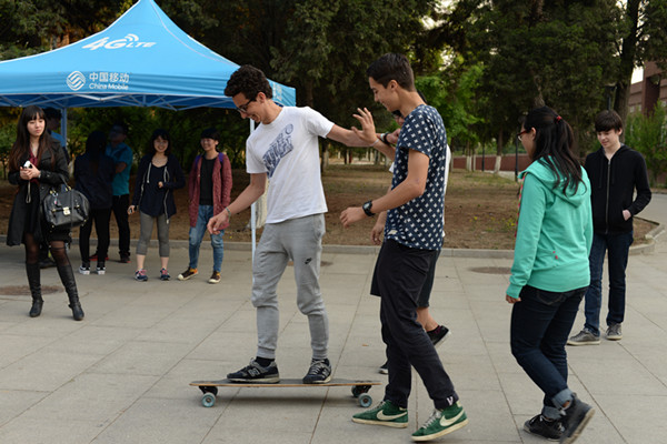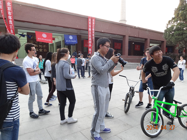 会后,法国师生在我院师生的带领下参观校园,并在学院旗杆处,我院小轮车及滑板、滑轮社的同学们为他们准备了精彩的表演,赢得阵阵掌声,法国同学们也兴致盎然地加入进来,大家一起度过了快乐的时光。