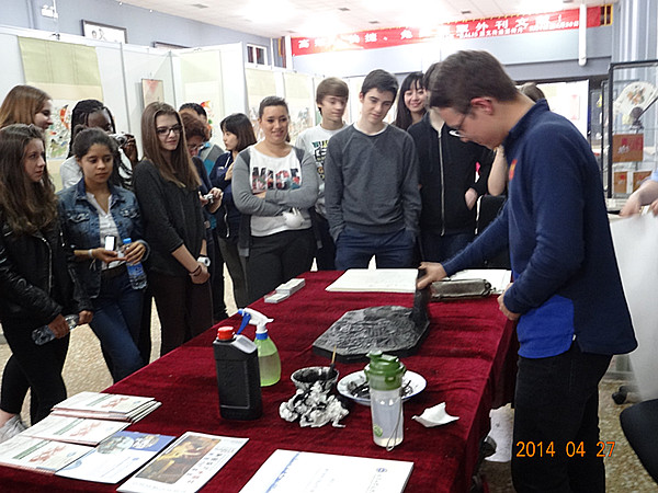 晚餐后,法国师生们又来到图书馆大厅,参观天津杨柳青画社的画展。画社资深讲解员为大家介绍了每幅作品的内容及涵义,同学们听得津津有味。最后,对中国传统文化兴趣浓厚的同学们,自己动手制作了木版画来纪念此次北京之行。