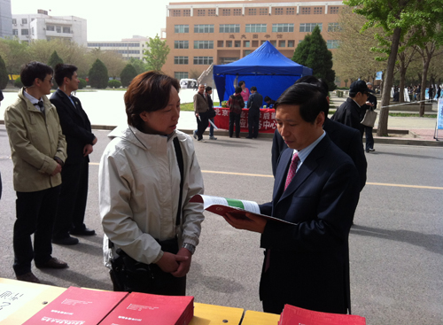咨询会现场,北京工业大学郭广生校长亲自到我院咨询台处,询问学院今年的招生情况,刘院长详细向郭校长做了汇报。