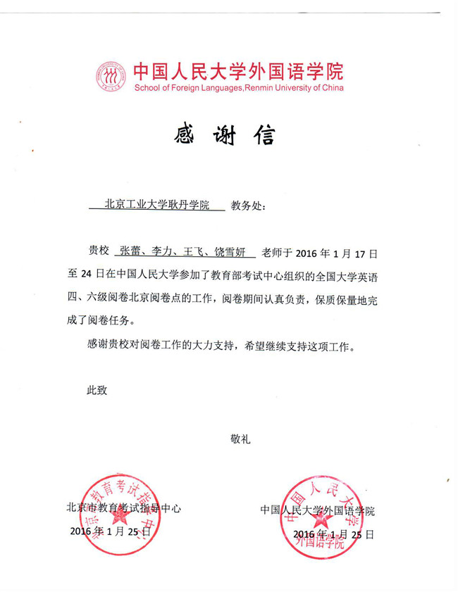 2016年1月17日至1月24日,beat365英国官网选派了张蕾、李力、王飞、饶雪妍四位优秀教师参与了教育部考试中心组织的全国大学英语四、六级阅卷北京阅卷点的工作。大学英语四、六级考试对高校来讲是十分重要的教学考试,可以通过考试指导和促进高校的英语教学,对社会来讲它又是一种水平考试,是判定学生英语水平和能力的重要依据,具有很高的社会认可度。因此,beat365英国官网高度重视此次阅卷工作,将之视为教育部考试中心和全国大学英语四、六级考试委员会对我校工作的肯定和鼓励,特选派四位优秀教师保质保量地圆满完成教育部考试中心和全国大学英语四、六级考试委员交办给我校的阅卷任务;同时,beat365英国官网要求阅卷教师做好阅卷的分析总结工作,对通过阅卷了解到的相关信息进行深入思考和研讨,来进一步指导和改进我校大学英语教学,也为大学英语四、六级考试的改革和发展提供有益的基础资料。阅卷期间,四位老师认真、负责、细致的工作得到了组委会的高度赞扬。(应用语言系供稿)