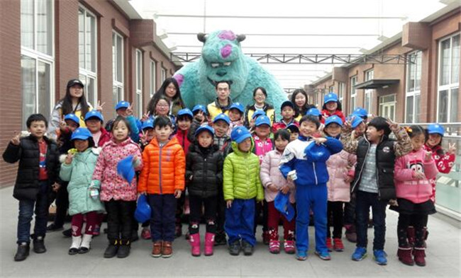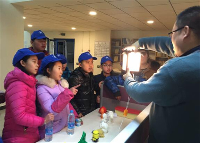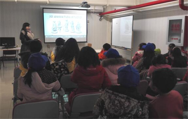 在艺术设计系,孩子们来到动画专业工作室,在动画专业李靓老师的细心讲解下,学习了如何自己动手制作简易的连环动画;随后观看了耿丹学生的动画作业,令人捧腹的卡通形象跃然荧幕之上,孩子们的注意力都被深深吸引,惊叹之余迸发出许多奇思妙想,最后开心地与动画专业毕业生的作品“毛怪”合影留念。
