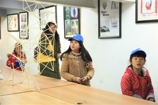 艺术系的最后一站,孩子们来到艺术设计系二楼参观学生形态认知课程的作品展。王洪洲老师和艺术系学生给孩子们解释了如何将日常生活中最常见的物品,小木棍、订书钉、西瓜等,转换成不同的形态,让他们惊奇不已。