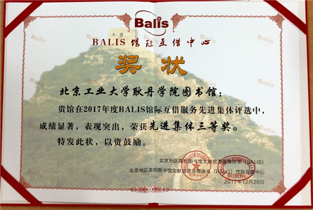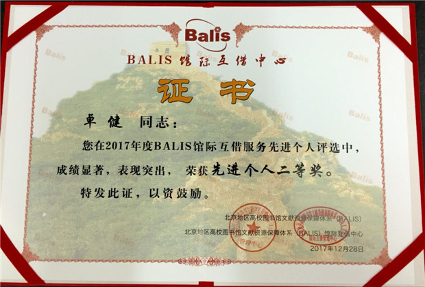 耿丹图书馆荣获2017年度“BALIS馆际互借先进集体三等奖”