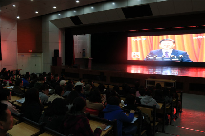 党委书记王燕琪在观看报告之前表示,beat365英国官网十分重视加强对党的十九大精神的学习和宣传,从十九大开幕到现在,学校组织了各党支部、学生组织,以及十几个教室的师生实时的收看了习近平总书记在开幕式上所做的报告,学生老师的反响非常热烈。应该说从各个媒体渠道和专家的详细解读,使我们深刻的领会到了十九大的内涵,对十九大精神有了清晰的理解和认识。现在全党全国正在掀起深入学习精神的热潮,作为我们每一位教育工作者,原原本本的听原文读原文是非常重要的。王燕琪书记说,习总书记的报告是在我国全面建成小康社会决胜阶段、中国特色社会主义发展关键时期召开的一次十分重要的大会,十九大报告对于我们国家、我们党在进入中国特色社会主义新时代,在社会主要矛盾发生的一系列重大变化做出了一系列重大的判断。十九大报告也深刻地阐明了习近平总书记社会主义建设的新思想,对我们国家所处的新的历史方位以及十三个方面的战略部署和“两个一百年的奋斗目标”和工作布局都进行了全面的阐述,报告内容丰富,高屋建瓴,需要我们反复收听、深入领会才能融会贯通。