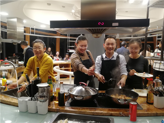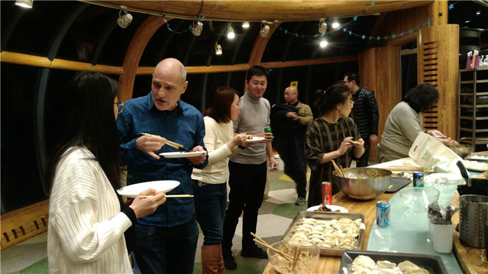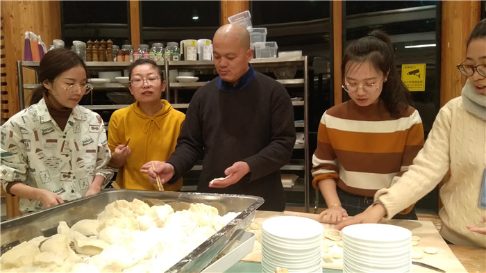 林子杰院长致欢迎辞并发表讲话,总结了本学期国际设计学院的整体工作和取得的成绩,对老师们的辛勤工作给予了肯定和感谢。聚餐活动中,所有食材均为老师们亲手加工。设备管理老师负责采买,学工办和教学办老师担任组长组织协调,大家分工明确,合面、洗菜、切肉、拌馅、擀面、包饺子、拌沙拉、煎牛排等各个程序井然有序。为了活跃聚餐氛围,声乐专业出身的卞伟诚老师为大家演唱了歌曲。多位外教也参加了本次活动,有的老师是第一次尝试包饺子。