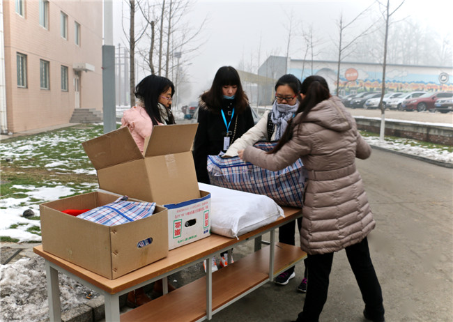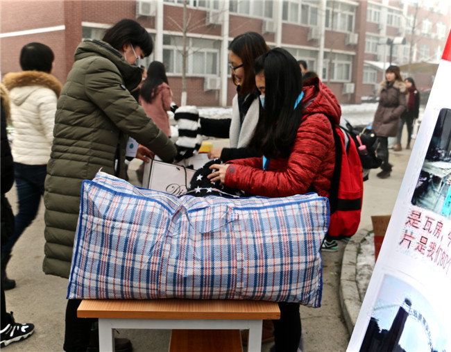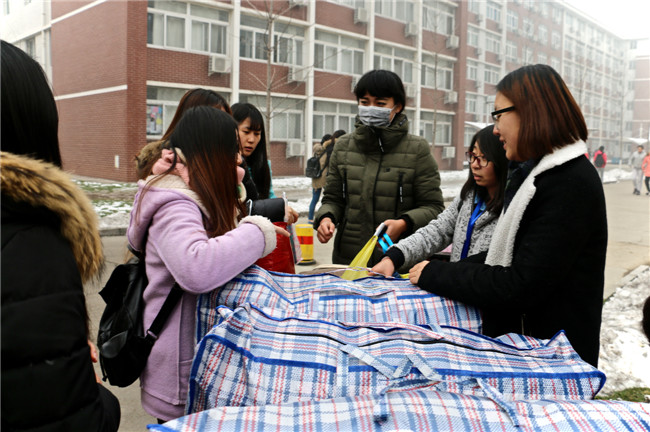 活动初期,青年志愿者协会通过微信公众平台发布活动信息,号召全体师生积极参与。消息发出后,获得积极响应和大量转发,还有很多老师同学亲自到团委办公室咨询相关事宜。12月1日中午,青年志愿者协会分别在一号和四号公寓楼下设置捐赠点。虽然当天天气状况极差,雾霾笼罩整个天空,但是同学们都热情高涨,前来捐献衣物的同学络绎不绝,仅仅两个小时,就收集了十余个编织袋的衣物多达百余件。志愿者们将全部物品整理打包,快递寄往爱心目的地。